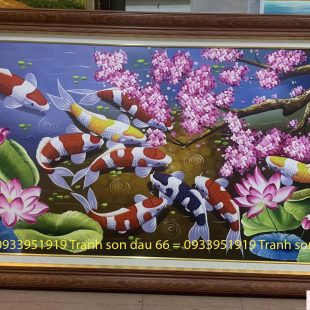 Tranh sơn dầu hoa sen cửu ngư quần hội, tranh hoa sen cá chép