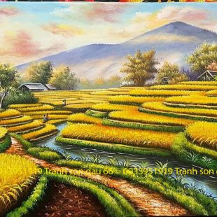 Tranh sơn dầu đồng quê làng quê xưa mùa gặt lúa chín 26