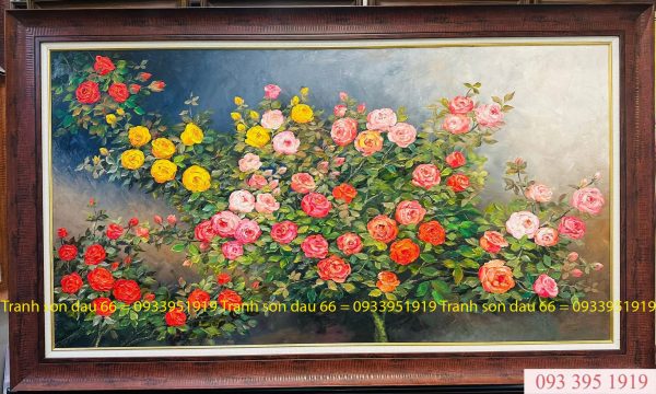 Bức tranh sơn dầu hoa hồng được họa sĩ khắc họa bằng nét cọ mềm mại, uyển chuyển. Từng lớp sơn được pha trộn tinh tế, tạo chiều sâu và hiệu ứng ánh sáng tự nhiên, khiến hoa hồng hiện lên sống động như thật. Sự phối hợp hài hòa giữa màu sắc và bố cục mang đến cảm giác ấm áp, thanh lịch và đầy mê hoặc cho không gian.