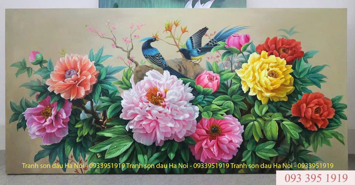 Tranh sơn dầu hoa mẫu đơn đôi chim tình duyên, sung túc