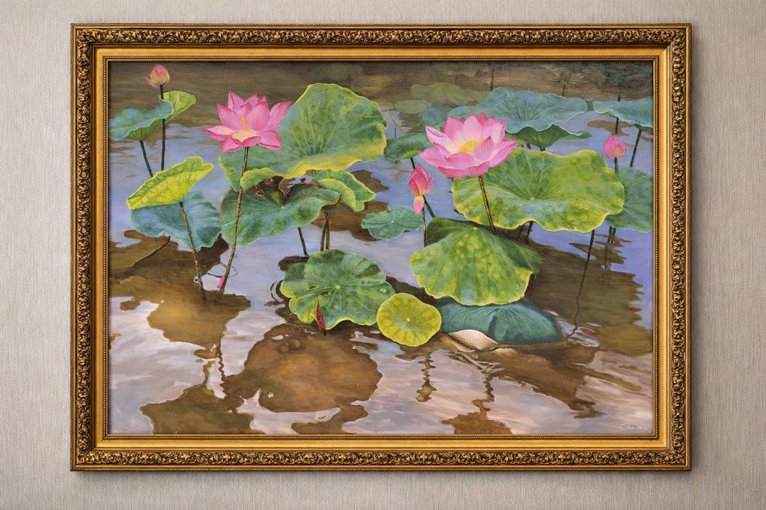 Tranh sơn dầu hoa sen đẹp, tranh hoa sen 3d vẽ tay