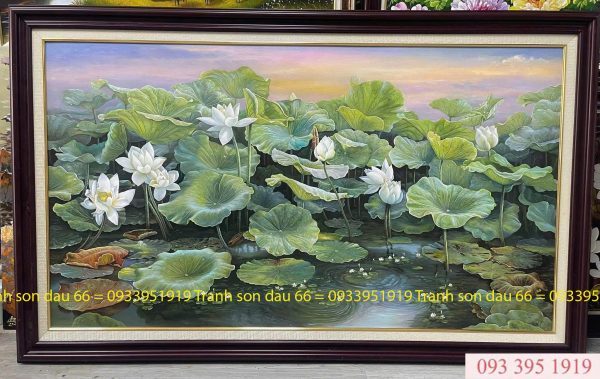 Với chất liệu sơn dầu, từng cánh sen trắng được thể hiện mềm mại và sống động, phản chiếu ánh sáng lung linh trên mặt hồ tĩnh lặng. Các họa sĩ thường khéo léo sử dụng gam màu xanh lam, xám nhạt hay vàng ấm để tôn lên sắc trắng tinh tế của hoa, tạo nên cảm giác an nhiên và thanh thoát cho người xem.